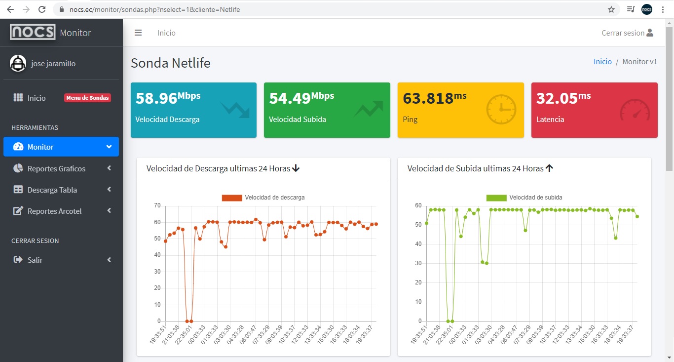 La sonda de medición, se conectará en un puerto del router principal entregado por el proveedor, e inmediatamente empezará a enviar la información a la base de dato del sistema. La plataforma de monitoreo se la encontrara en la dirección: www.nocs.ec/monitor/ donde se deberá ingresar el usuario y contraseña proporcionado al cliente para la revisión de los parametros medidos de su servicio de internet.